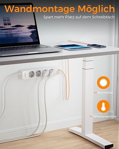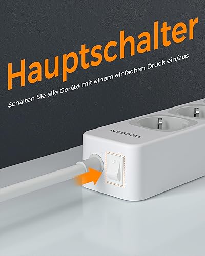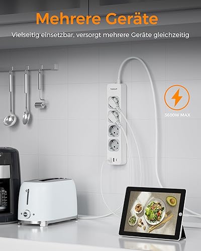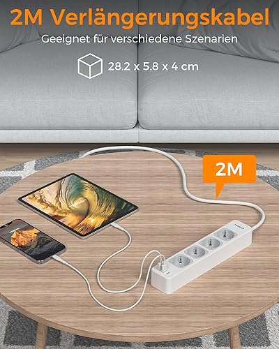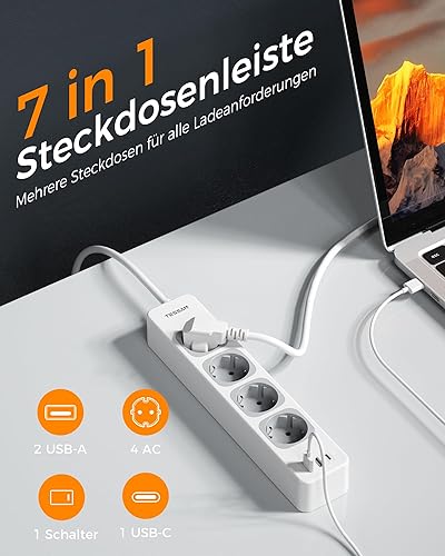 TESSAN 4 Fach Mehrfachsteckdose mit USB C und 2 USB A, 7 in 1 Steckdosenleiste Verlängerungskabel 2M, Mehrfachstecker mit Schalter, 3600W Verteilersteckdose Steckerleiste, Grau