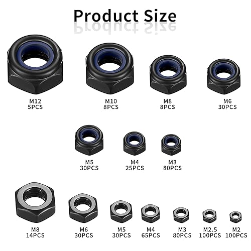 595 Stück Sechskantmutter Satz, Kohlenstoffstahl selbstsichernde Mutter, Nylon-Sicherungsmutter, Sicherungsmutter Kombination, Sechskantmutter, Mutter Satz M2 M2.5 M3 M4 M5 M6 M8 M10 M12