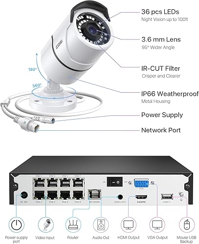 ZOSI 5MP PoE Außen Überwachungskamera Set 8CH 5MP 2TB HDD NVR Plus 4X 5MP Videoüberwachung IP PoE Kamera Set 36M IR Nachtsicht