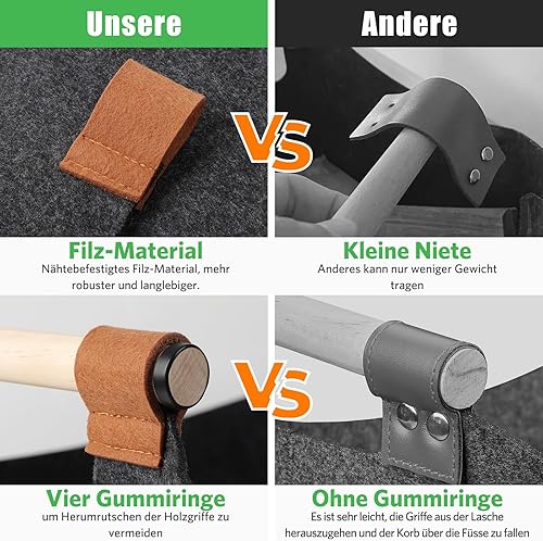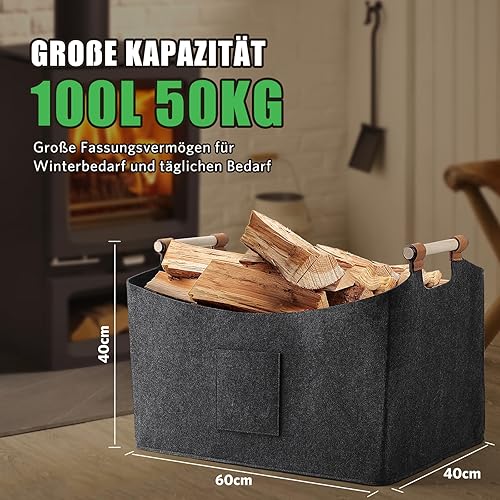 Ciberate XXXL 100L Filzkorb Holzkorb für Kaminholz Brennholzkorb Faltbare Filztasche mit rutschfester Griffe und Fronttasche Feuerholzkorb als Aufbewahrungskorb für Holz, Einkauf (60x40x40cm)