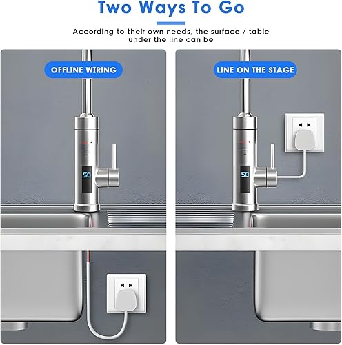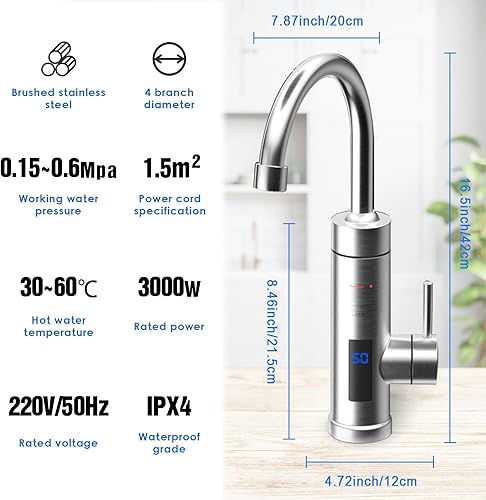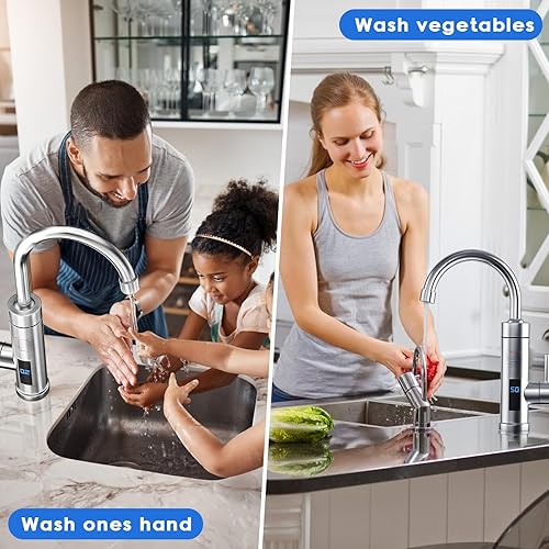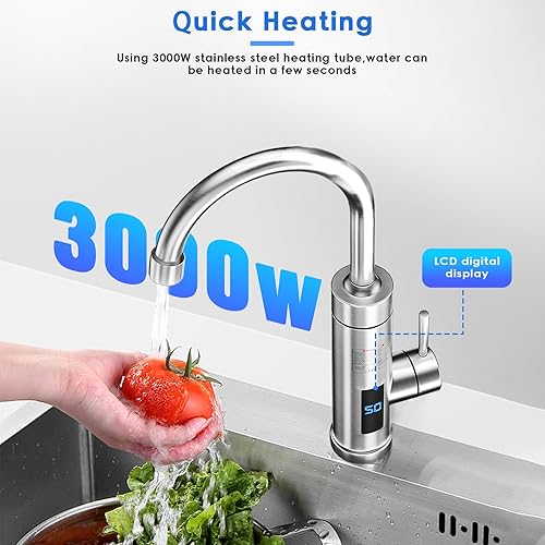 Elektrischer Wasserhahn für Durchlauferhitzer aus Edelstahl, Wasserhahn warm und kalt, 3000 W, Thermometer ohne LED, Warmwasserhahn für Küchenspüle, 360 ° drehbarer Wasserhahn