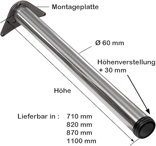 Stahlia 1x Tischfuß Ø60 mm SCHWARZ MATT Tischbein Möbelfuß |Höhe : 1100 mm | höhenverstellbar + 30 mm|inkl. Befestigungsmaterial
