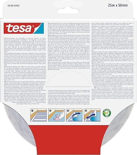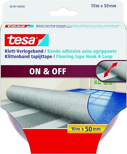 tesa Klett-Verlegeband On & Off - selbstklebendes Klettband zum Verlegen von Teppichen - rutschfest, für Feuchträume und Fußbodenheizung geeignet - 25 m x 50 mm - transparent