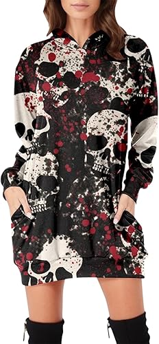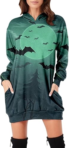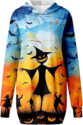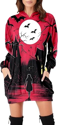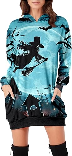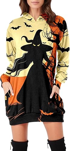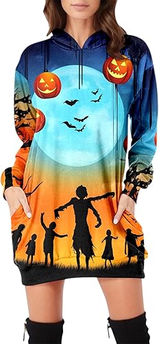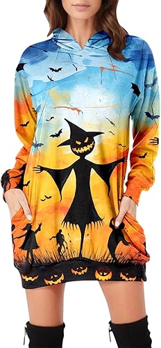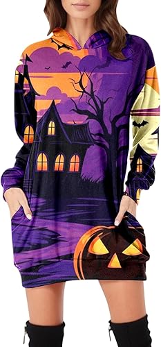 Halloween Hoodiekleider Damen Festlich Kürbis Gedruck Kleid Pullover Damen Langarm Rundhals Sweatkleid Longpullover Party Tunika Mini Kleid Sweatshirt Winterkleid Oversize Herbst Freizeitkleid