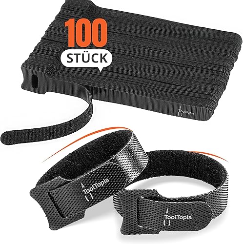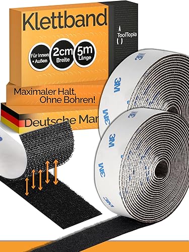 Klettband Selbstklebend Extra Stark Outdoor & Indoor 20mm x 5m schwarz (3M Markenkleber), Klett I Klettverschluss Klebeband, Velcro Tape für DIY, Basteln, Haushalt, Nähen...ToolTopia Handwerksqualität