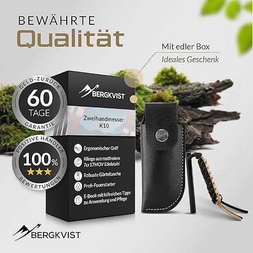 BERGKVIST® K10 Klappmesser (Zweihandmesser) - scharfes Taschenmesser für Outdoor & Survival mit Feuerstahl & Tasche - Mitführen in Deutschland erlaubt - Vollmetall