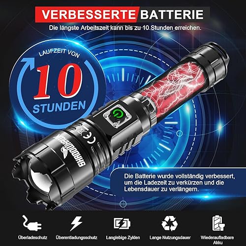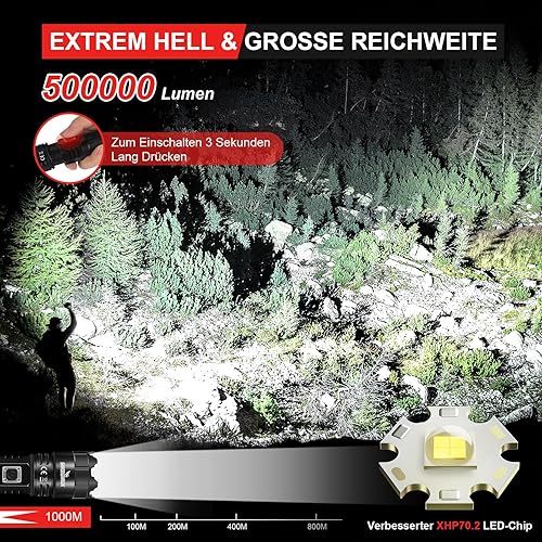 Shadowhawk LED Taschenlampe Aufladbar, Extrem Hell 500000 Lumen Taschenlampen Batteriebetrieben USB, XHP70.2 Taktische Taschenlampe, IP67 Wasserdicht 5 Lichtmodi Zoombar für Camping Wandern Notfälle