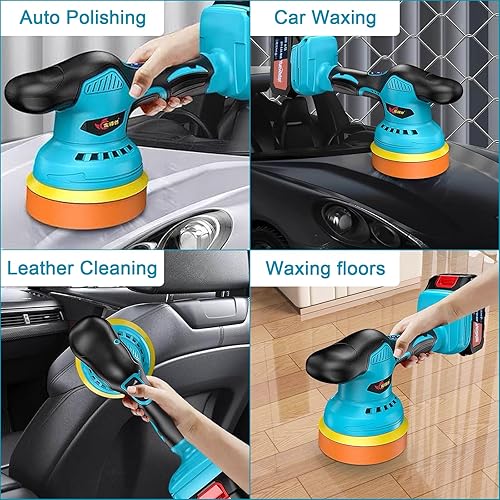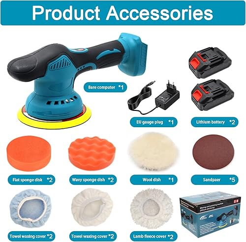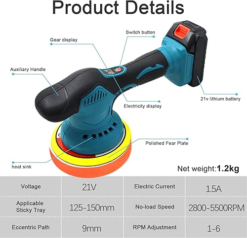 Akku Poliermaschine,2Pcs 21V Akkus 6 Gang Variable 2800–5500 U/min, tragbares 15cm Polierset mit 2 12-V-2,0-Ah-Batterien zum Polieren und Wachsen von Automobilen, Holz und Leder