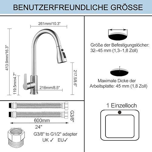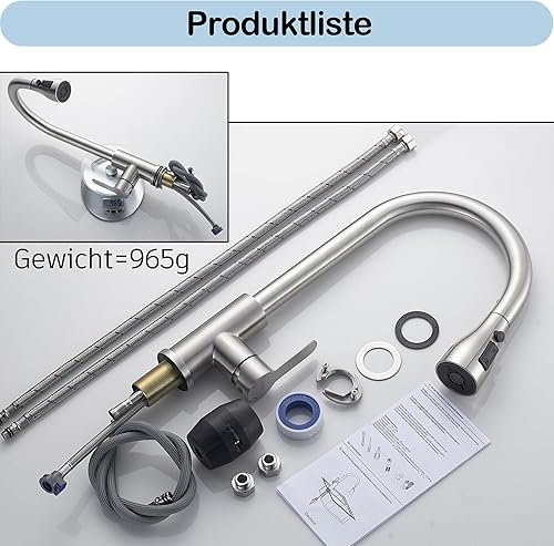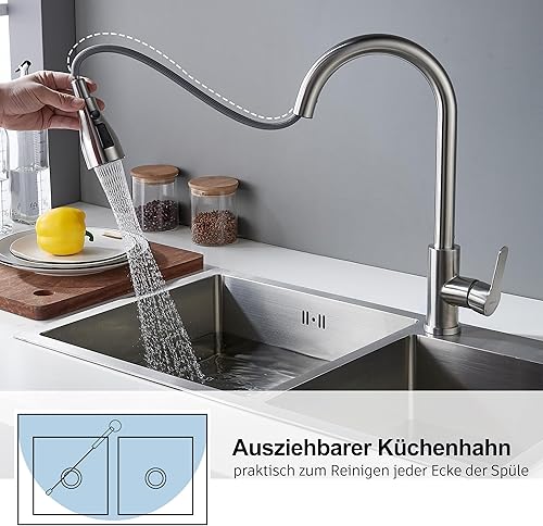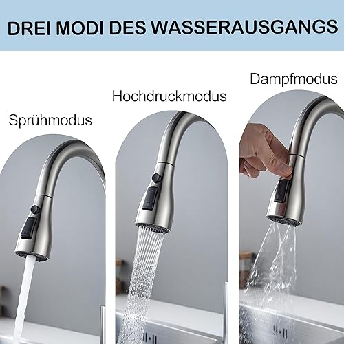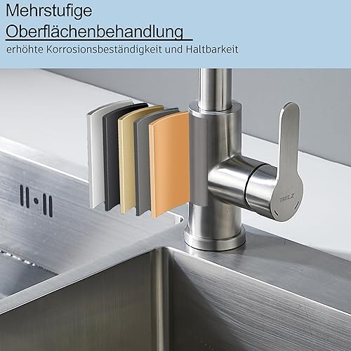 BELZ Wasserhahn Küche Ausziehbar, Hochdruck Küchenarmatur mit Herausziehbarer Brause, Mischbatterie Spültischarmatur, 360° Schwenkbar, 3 Sprühfunktionen, Edelstahl