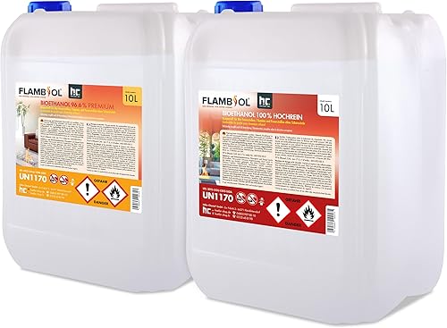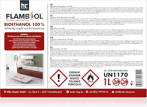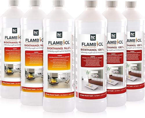 Höfer Chemie 6 x 1 L FLAMBIOL® Bioethanol Probierset für Ethanol Kamin, Ethanol Feuerstelle, Ethanol Tischfeuer und Bioethanol Kamin