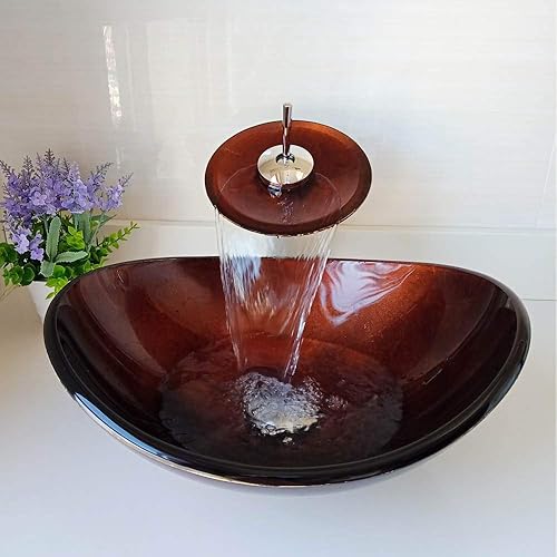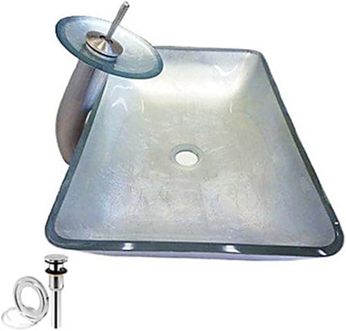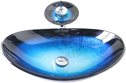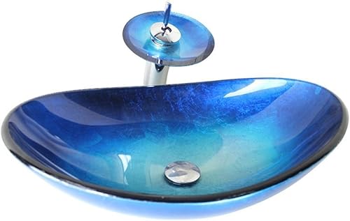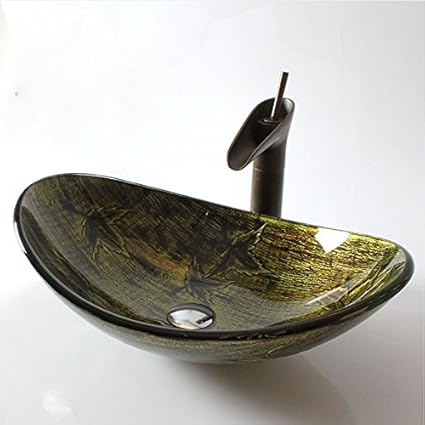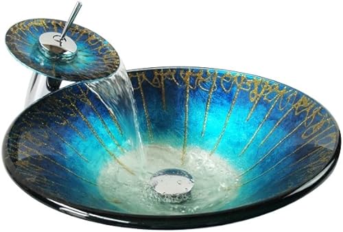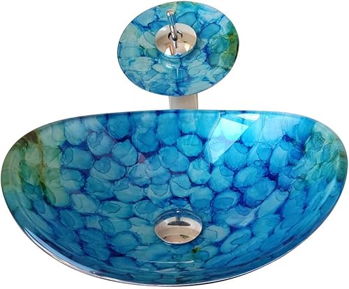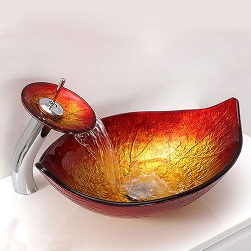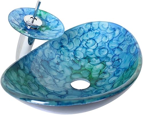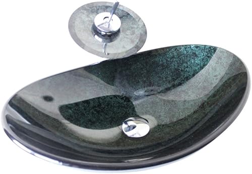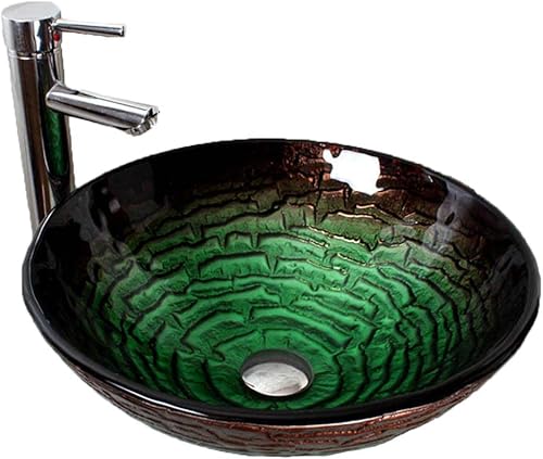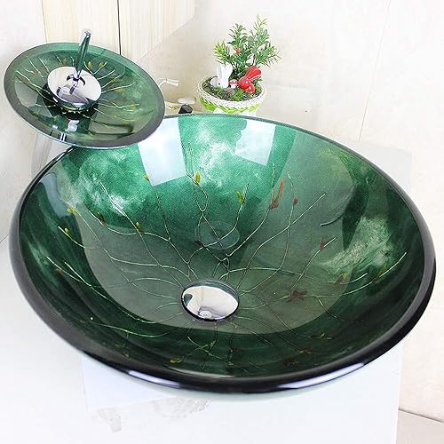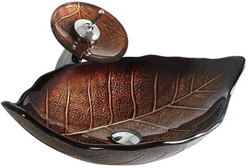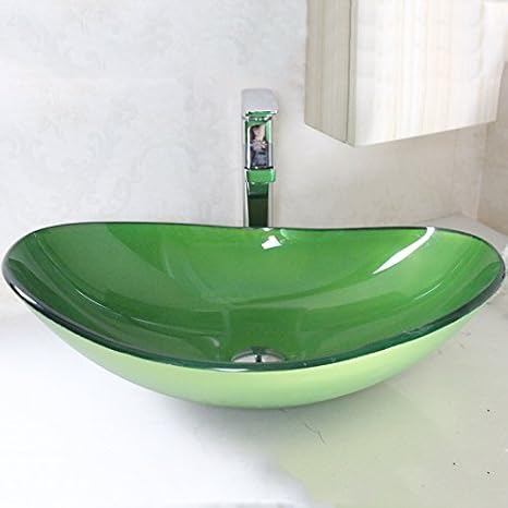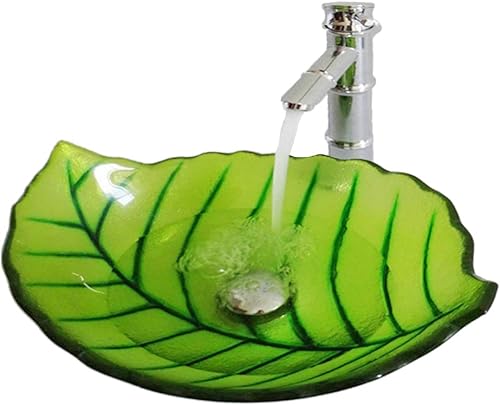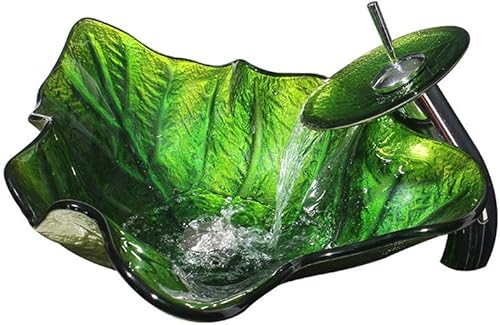 Homelava Modern Gehärtetes Glas Waschbecken Blatt Design Glas Aufsatz Waschschale mit Wasserfall Wasserhahn (Grün)