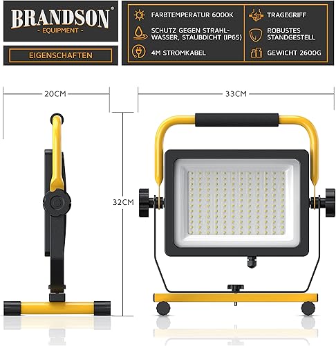 Brandson - 100W LED Baustrahler 144 SMD LEDs – Arbeitsleuchte – Bauscheinwerfer – Baulampe - Tragegriff 6000K – 10000 Lumen – 4 m Stromkabel – Metallgehäuse – IP65