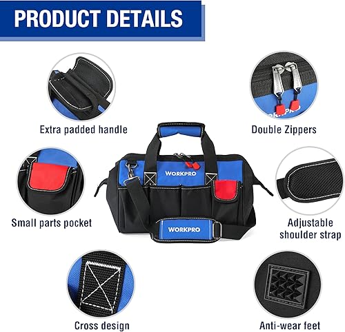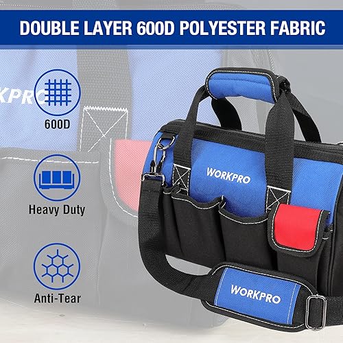 WORKPRO Werkzeugtasche Elektriker, Wasserdichte Werkzeugtasche Profi, weite Öffnung & große Kapazität 35CM aus 600D Polyester, Schultergurt verstellbar, Multifunktion für Heimwerker Handwerker