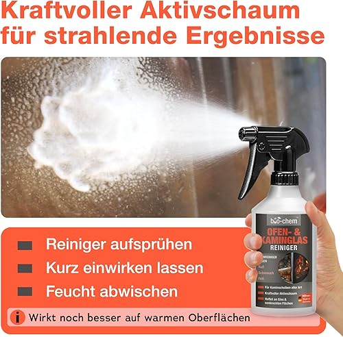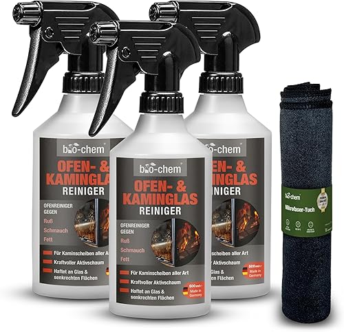 bio-chem Ofen- und Kaminscheibenreiniger Kaminglasreiniger - 3x 500 ml Hochleistungs-Aktivschaum inkl. Mikrofasertuch - Entfernt mühelos hartnäckige Ablagerungen wie Ruß, Fette, Rauchharz - Made in DE