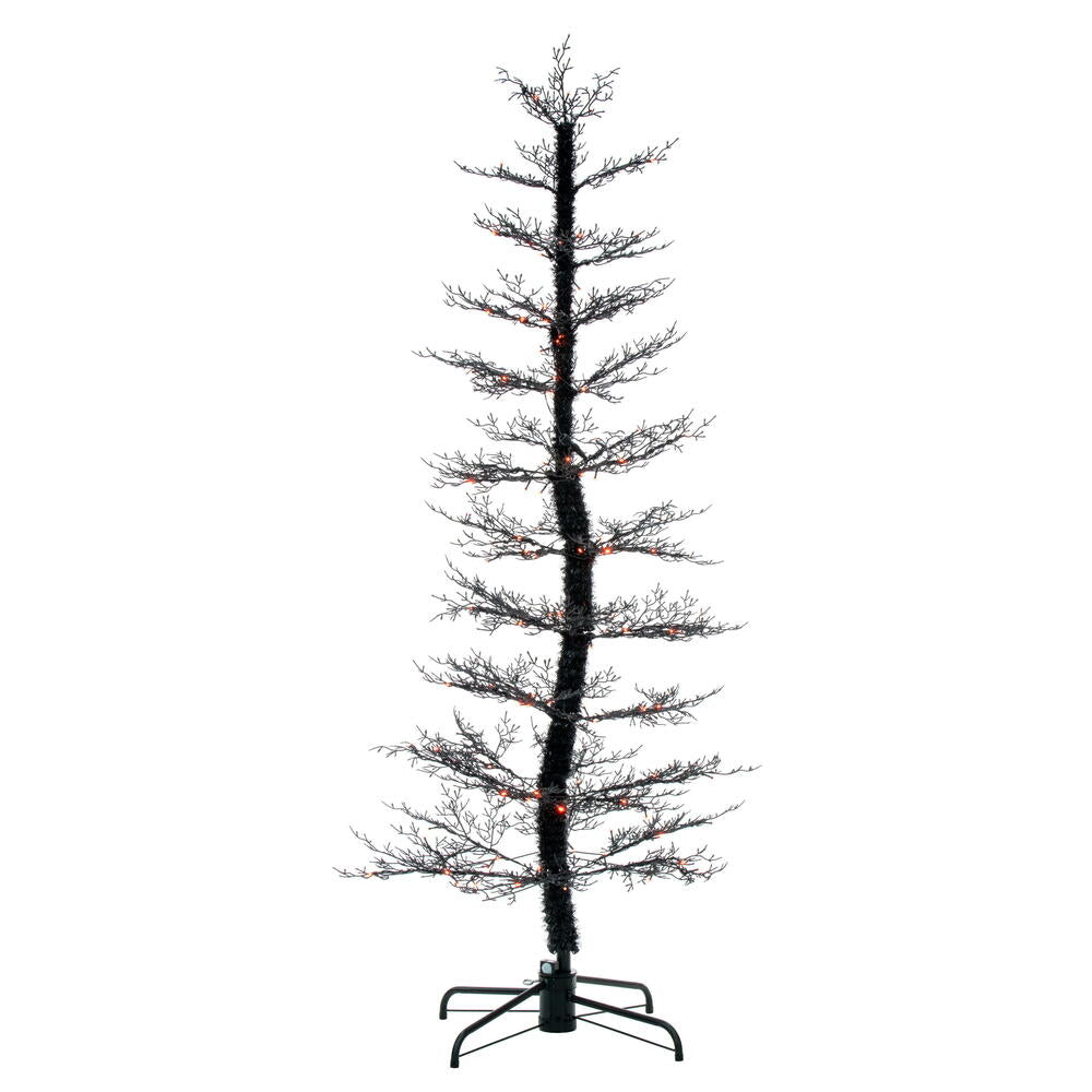 Vickerman 7' x 38" Black Cedar Pre-lit Halloween Tree with 170 Orange and Purple Lights. This tree measures 7 feet tall and 38 inches wide. It comes with a black metal folding stand. It is pre-lit with 170 multi function 2MM lights. The light functio