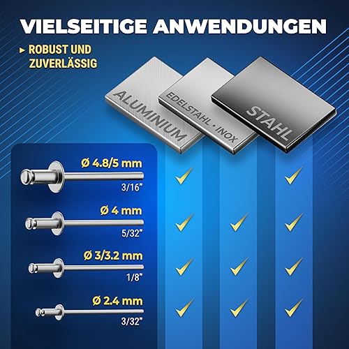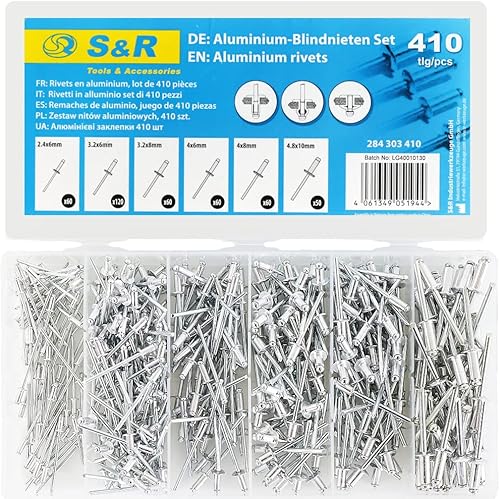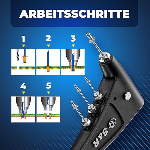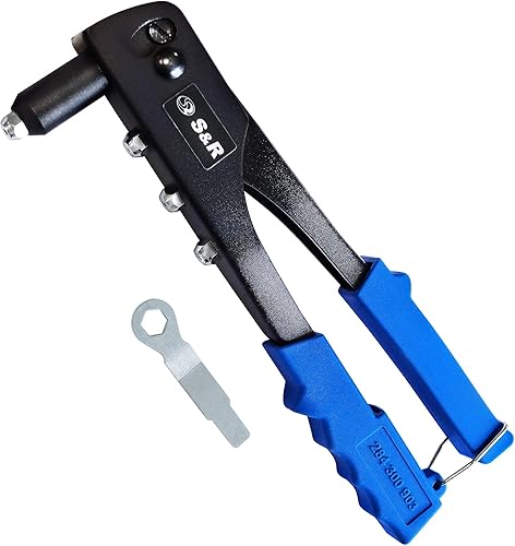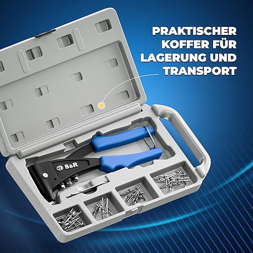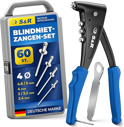 S&R Nietzangen-Set für Aluminium, Stahl & Edelstahl Blindnieten (M3-M6), zuverlässige Einhand-Blindnietzange mit 60 Nieten und Rückholfeder, Popnietenzange mit Popnieten, in robustem Koffer