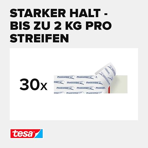 tesa Powerstrips Large im 3er Pack - Doppelseitige Klebestreifen zur Montage von Gegenständen auf glatten Oberflächen - Bis zu 2 kg Halteleistung - insgesamt 30 Powerstrips Weiß
