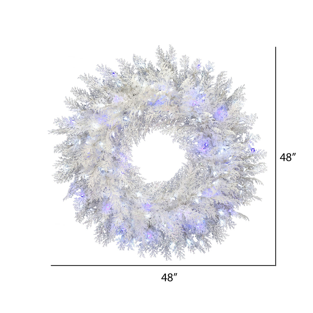 Vickerman 48" Flocked Cedar Pine Artificial Christmas Wreath Pure White and Blue Low Voltage LED Wide Angle Twinkle Lights.