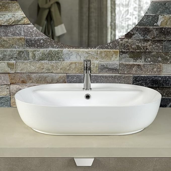 ERCOS Ovales Aufsatzwaschbecken aus Keramik, Badwaschbecken Weiß glänzend mit integriertem Überlauf, Maße 616X415 MM