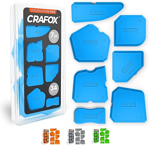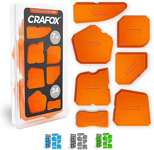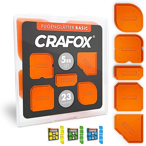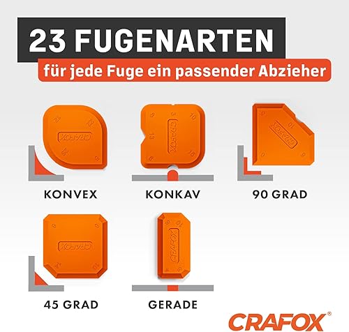 CRAFOX® Fugenglätter 5er SET ORANGE | das Tool für perfekte Fugen | Silikon Abzieher mit 23 Fugenformen | Fugenabzieher inkl. Aufbewahrungsbox | Acryl & Silikonabzieher | Glätter Spachtel Werkzeug