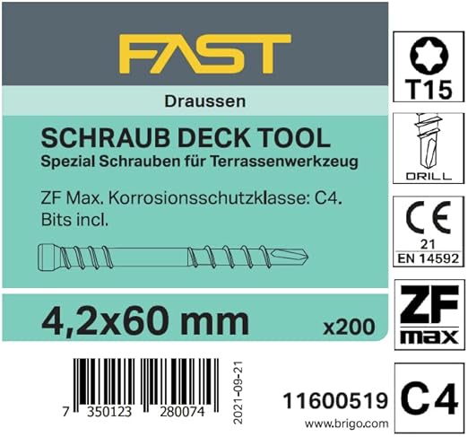 FAST deck-tool™ I Terrassenschrauben 4,8 x 60 mm I legierter Stahl Güteklasse C4 I 200 Stück inkl. speziellem FAST Bit