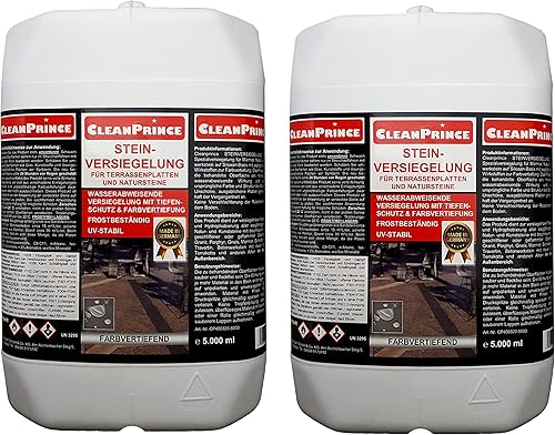 CleanPrince 2x5= 10 Liter Steinversiegelung für Terrassenplatten und Natursteine | mit Farbvertiefer | Steinsiegel Marmor Granit Natursteine Beton farbvertiefend