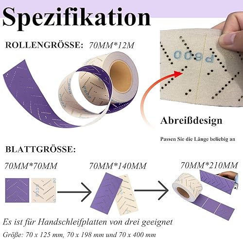 Clean Schleifpapier Rolle Purple Clean Schleifrollen 70 mm x 12 m Multi-Hole Schleifpapierrolle Rechteckig Von Hand Zerrissen Schleifpapier zum Entfernen von Beschichtungen, Autoschleifen, Körnung 400