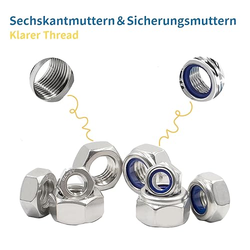 200 Stück Sicherungsmuttern Sortiment, Edelstahl Selbstsichernde Muttern, M3 M4 M5 M6 M8 M10 M12 Gewindeeinsätze Sechskantmuttern Set, Verschiedene Nylon-Sicherungsmuttern