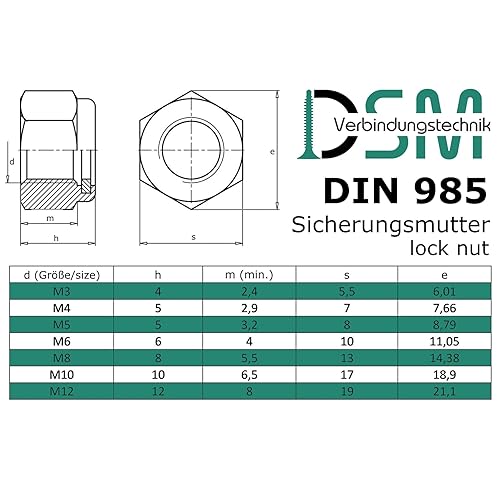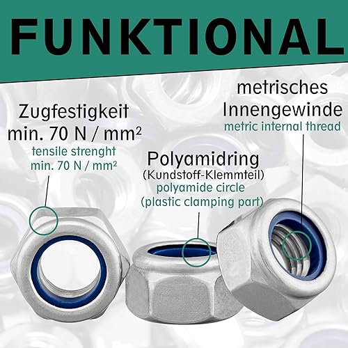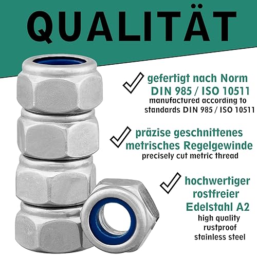 Sicherungsmutter Sechskantmutter DIN 985/ISO 10511 Standard Form Edelstahl A2 V2A, Stoppmutter selbstsichernde Mutter Edelstahlmutter Sechskant Schraubenmutter (M8, 50 Stück)