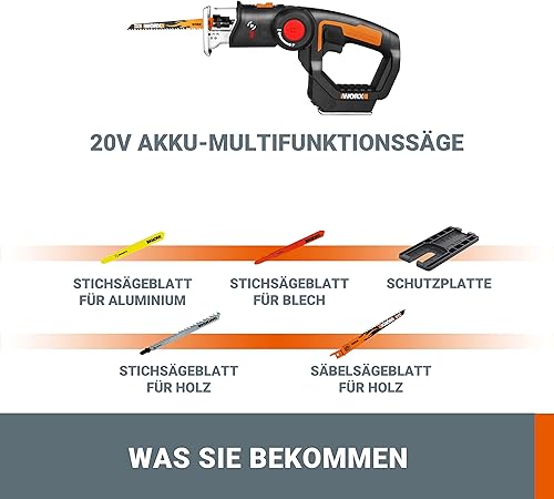WORX WX550.9 Stichsäge zum Schneiden von Holz, Stahl & PVC – 2-in-1 Universalsäge mit Stich- & Säbelsäge & schneller Umstellung – 20V – Mit Staubbläser & Pendelhub – Ohne Akku & Ladegerät
