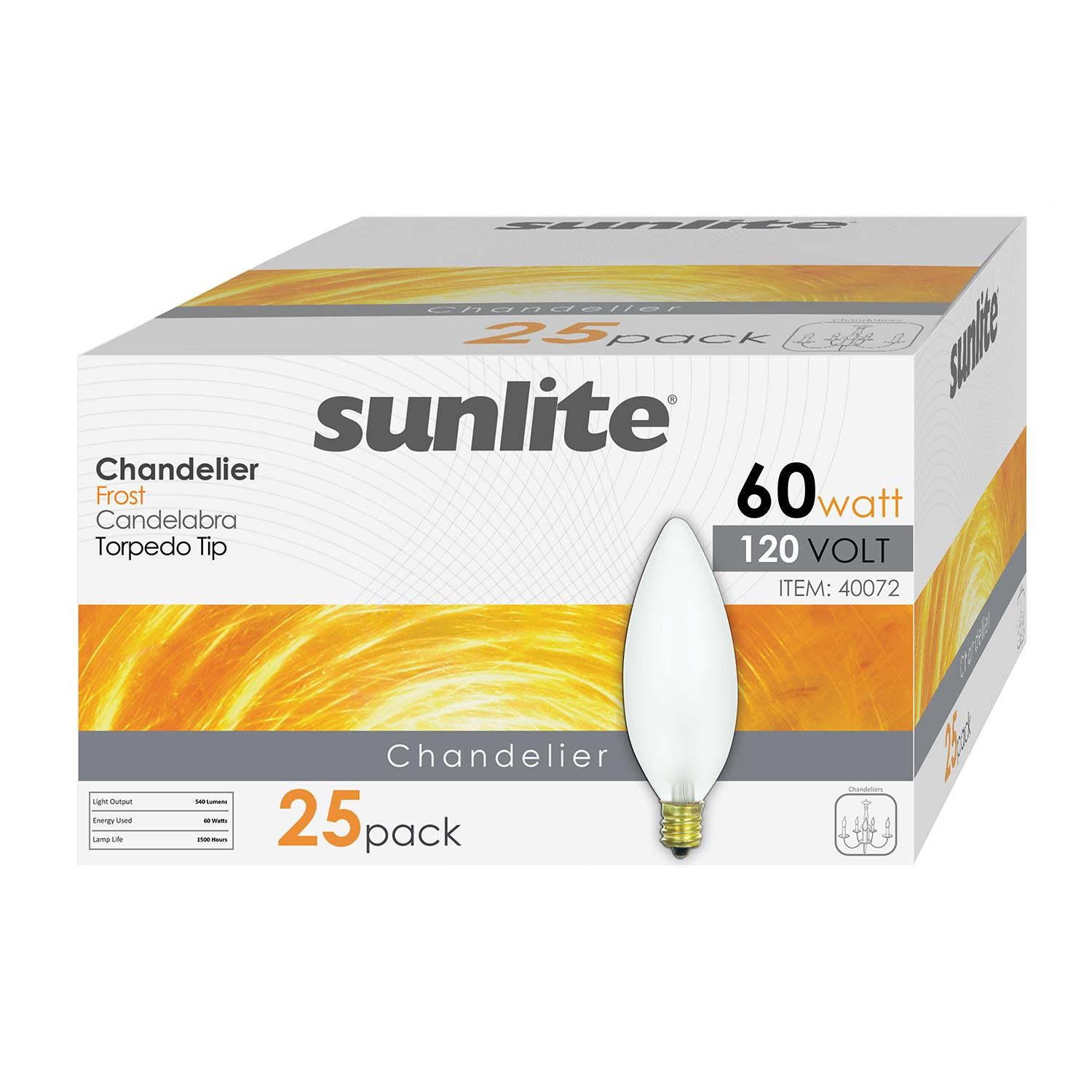 Sunlite 60 Watt Torpedo Tip Chandelier , Candelabra Base, Frost