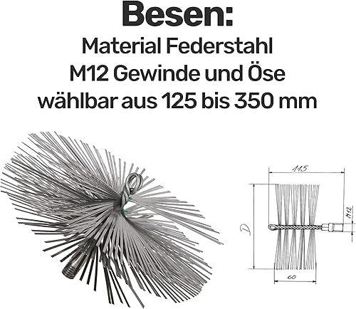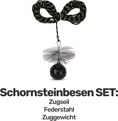 Renomo24 Schornsteinbesen Federstahl | Zuggewicht 1,9kg | Besengröße 225mm | Zugseil Länge 15m | Reinigungsset für effiziente Schornsteinpflege