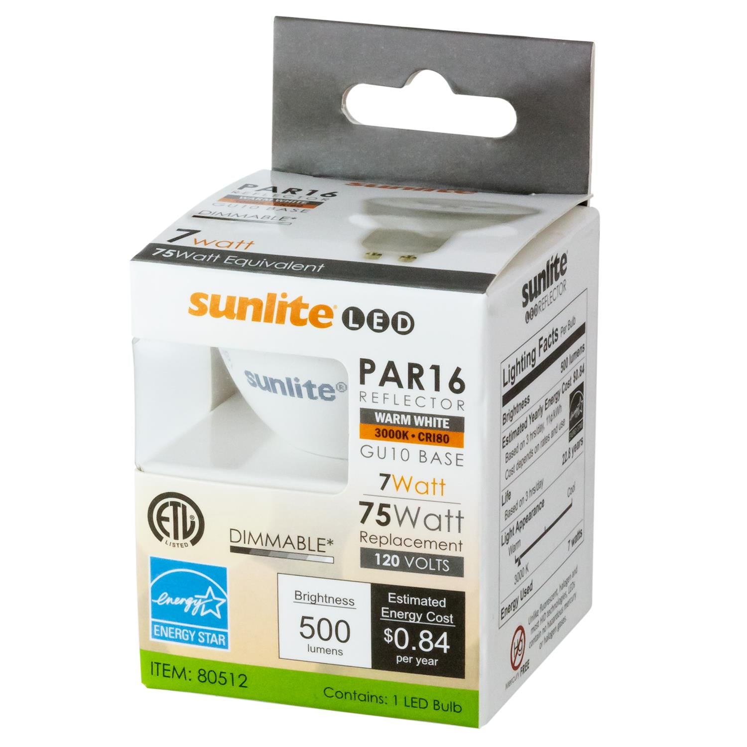 Sunlite LED PAR16 Bulb, Dimmable, 7 Watts (75 W Equivalent), GU10 Base, 2700K Warm White, Energy Star Compatible