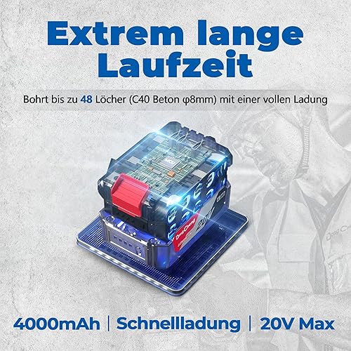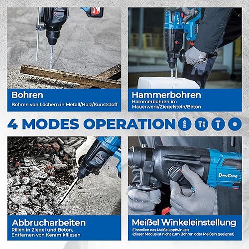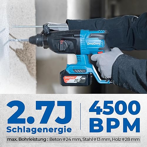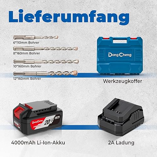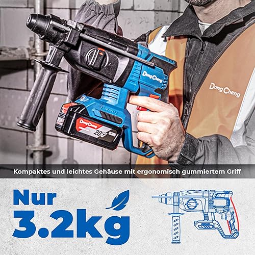 DongCheng Akku Bohrhammer 18V, Schlagenergie 2.7 J, mit 4 Stück SDS-plus, Bohren bis 28 mm, Bürstenloser Bohrhammer Motor, Anti-Vibrationsgriff, inkl. 4Ah Akkus und 2A Ladegerät im Handwerkerkoffer
