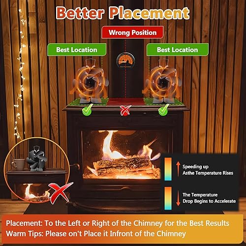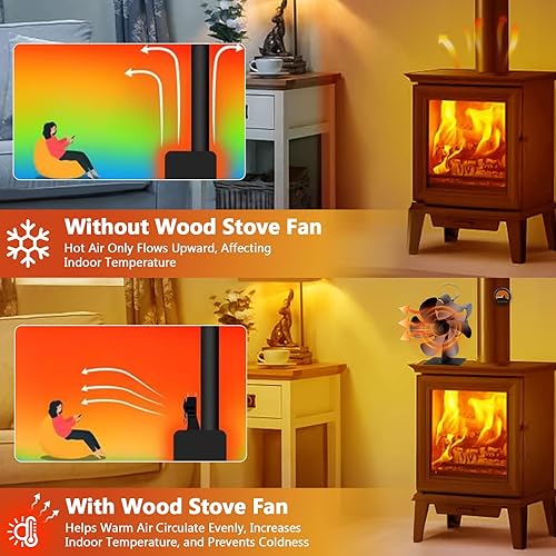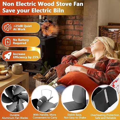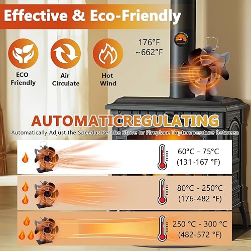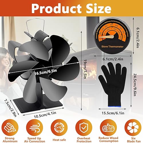 BBLTIFF Kaminventilator, Ofenventilator mit 6 Blätter, Ofenventilator Ohne Strom mit Thermometer und Handschuhen Geliefert, Leise Zirkulierend, Kaminofen Ventilator für Kaminöfen & Holzofen