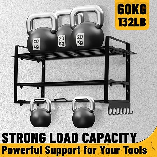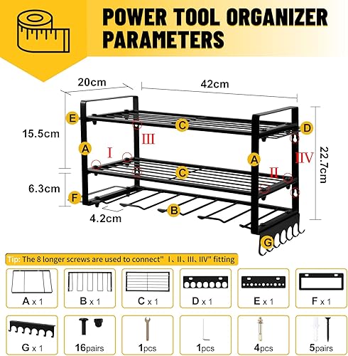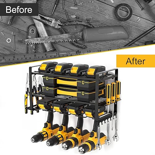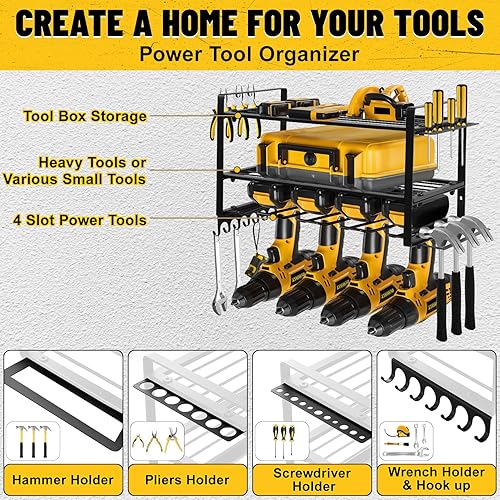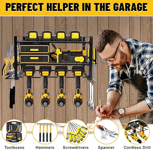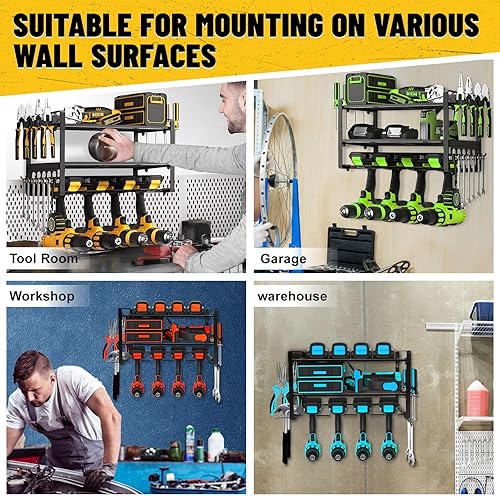 Votoko Werkzeugspeicher Wandhalterung für 4 Elektrowerkzeug, 3 Ebenen Hochleistungs Metall Werkzeugregal mit Schraubendreher-Gestell für Garage & Werkstatt