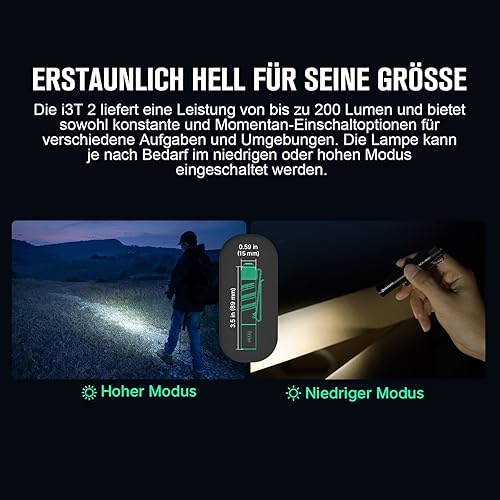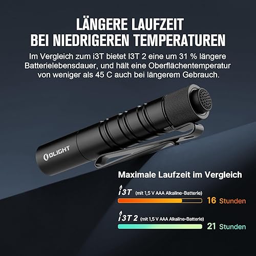 OLIGHT I3T 2 Mini Taschenlampe, 200 Lumen Kompakte Helle Licht mit beidseitigem Taschenclip, 2 Lichtmodi AAA-Batterie Lampe mit Endkappenschalter für Camping Outdoor und Wandern