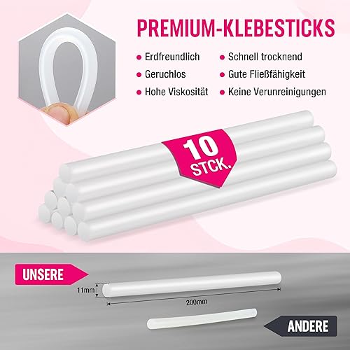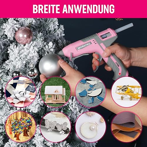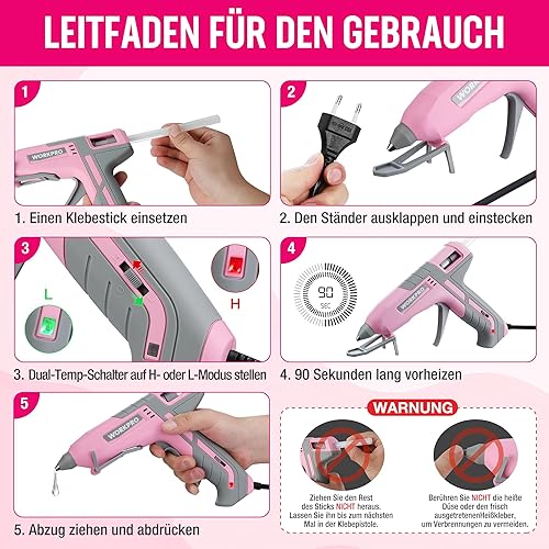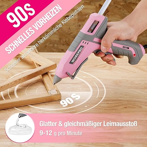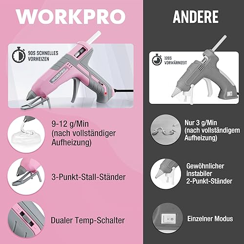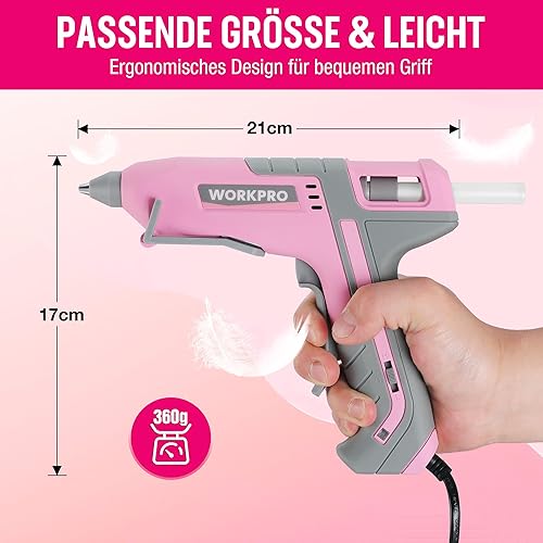 WORKPRO Heißklebepistole, 60/100 W Klebepistole mit 10 Heißklebesticks, Zwei Heizmodi, Schnelle Verklebung 9-12 g/min, 90s Schnellvorheizung, 3-Punkt-Halterung, für DIY und Reparaturen, Rosa&grau