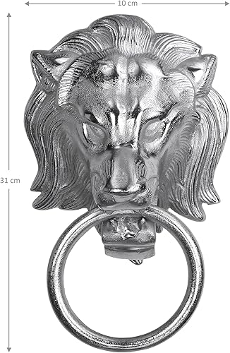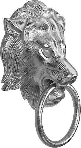 WOMO-DESIGN Handtuchhalter Löwenkopf mit Ring, aus Aluminium vernickelt, Unikat, Silber, (BxH): 10x31 cm, Designer Löwenkopf, Handtuchring Türklopfer Löwe Lion Wandfigur WC Bad Dekoration Accessoire