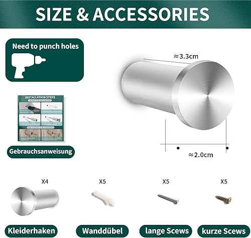 Giookuj Handtuchhaken zum Bohren SUS304 Edelstahl Garderobenhaken Bohren Wandhaken Kleiderhaken Schrauben Heavy Duty Gebürstet Silber 4 Packs