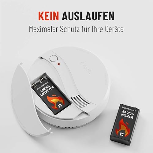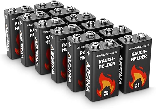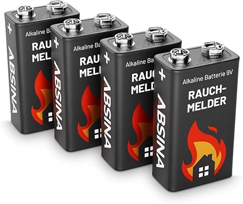 ABSINA Rauchmelder Batterie 9V Block - 4er Pack Alkaline 9V Block Batterien langlebig & auslaufsicher - Blockbatterien für Feuermelder, Bewegungsmelder, Kohlenmonoxid, Warnmelder & Rauchwarnmelder
