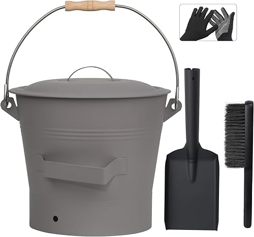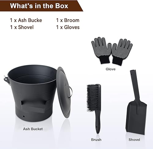 BRIAN & DANY Ascheeimer mit Deckel, Runder Kohleeimer für Kamine, 10L Eimer mit Schaufel und Handbesen, Werkzeugset Zubehör für Kamin, Feuerstelle, Holzofen