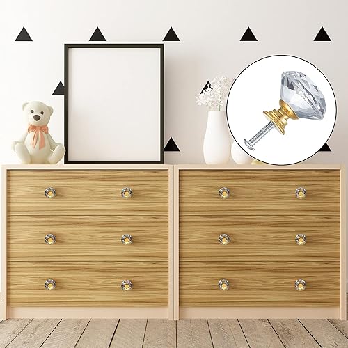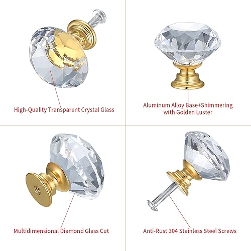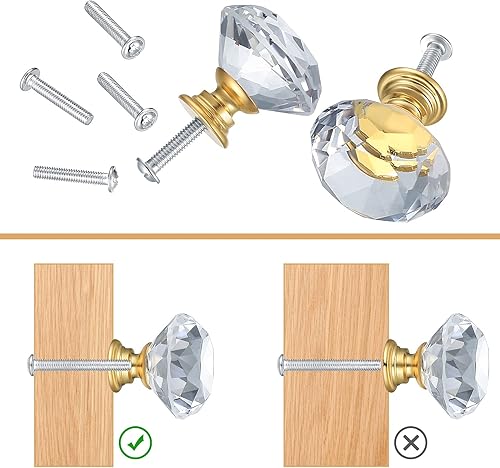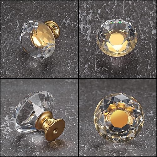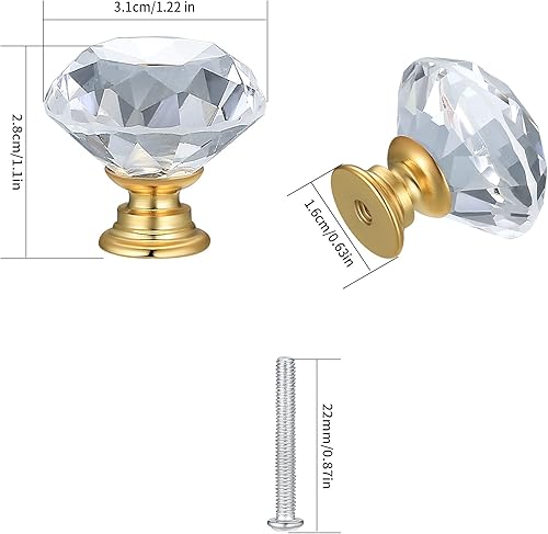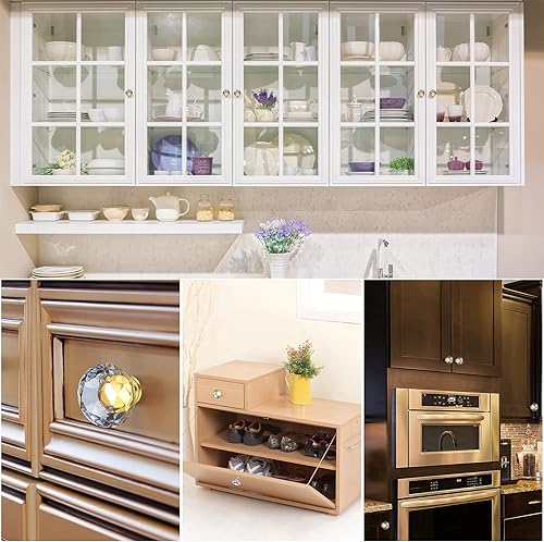 Bateya 12 Stück Kristall Türknauf Schubladenknöpfe, Kristall Tür- und Schubladenknöpfe aus Glas mit Schrauben für Kleiderschrank klarer Knopf (goldener Sockel)
