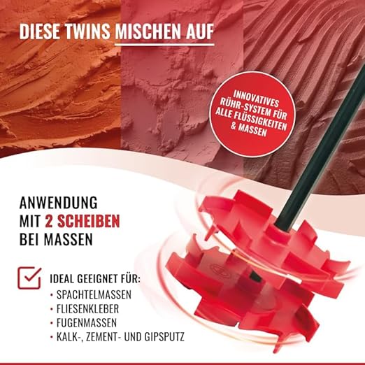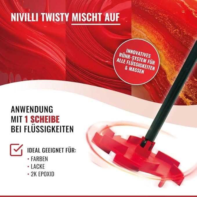 Nivilli TWIST-QUIRLY Dissolver-Set, Rührwerk/Rührstab für Bohrmaschine & Akkuschrauber. Epoxidharz-, Spachtelmasse-, Putz-, Farb-Mixer. Blasenfreie Vermischung. Stab 500mm (Ø10mm) + 2x Scheibe 100mm