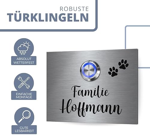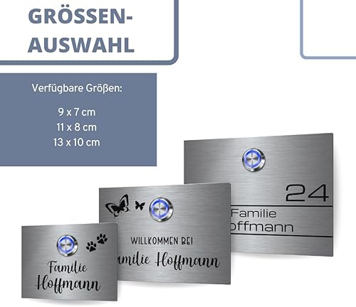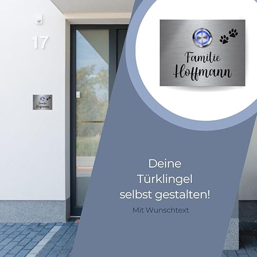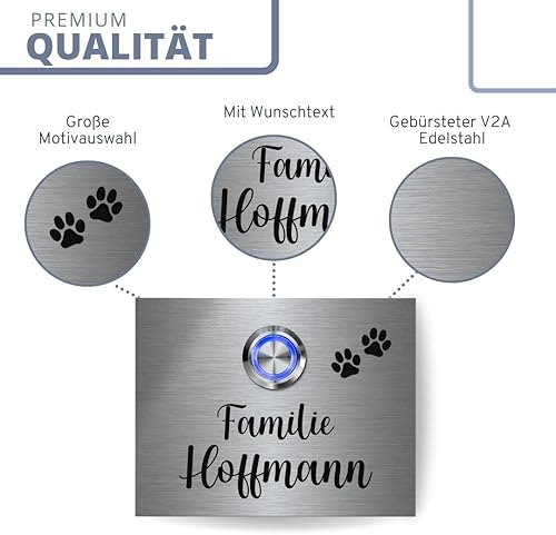 Edelstahl Klingelschild mit indivudeller Gravur und Motiven - Modell Hoffmann ab 9x7 cm | langlebige Türklingel aus rostfreiem V2A-Edelstahl mit beleuchtetem Klingelknopf und optionalem Zubehör
