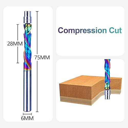 SpeTool Bündigfräser 6mm Schaft Spiralnutfräser Up&Down Kompressions VHM Schnittbreite 28mm Kopierfräser für Oberfräse Spiralgenutet DLC Beschichtung doppeltem Kugellager Unten zum Holzbearbeitung