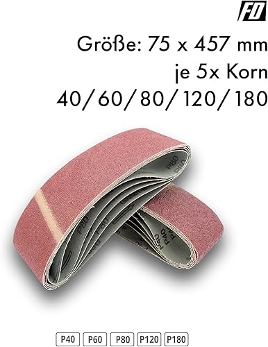 Gewebe-Schleifbänder │ 25 Stück │ 75 x 457 mm │ je 5 x Korn 40/60/80/120/180 │ für Bandschleifer │ Schleifpapier │ Schleifband-Set