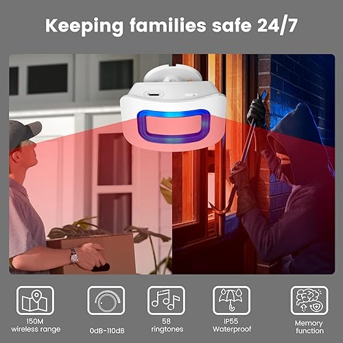 BITIWEND Durchgangsmelder Funk Bewegungsmelder Alarm Ladentür PIR Bewegungssensor Innen Tür Funkklingel mit 58 Melodien Kabellos Infrarot Ladenglocke Alarmanlage für Wohnmobil, Zuhause, Garage