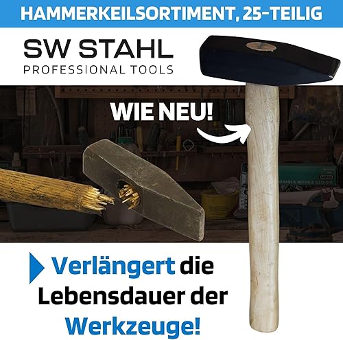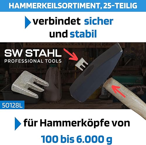 SW-Stahl 50128L Hammerkeilsortiment 25-teilig I Stielbefestigungskeil Set aus verschiedenen Größen I Hammerkeiler für 100 g - 6 kg Kopfgewicht I sichere Verbindung zwischen Hammerstiel und Hammerkopf