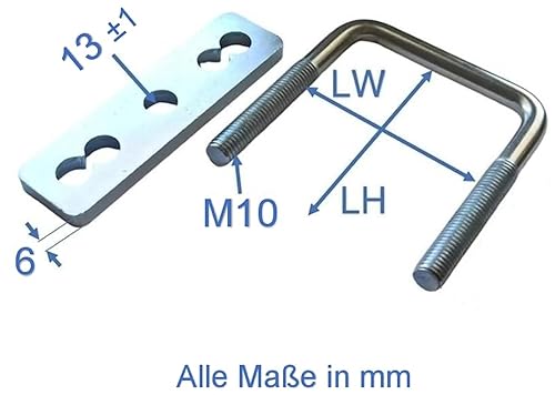 1 Stück quadratische, vierkant M10 U Schrauben, U Bolzen, U Bügel mit Gewinde, Gegenplatten, Sicherungsmuttern, Unterlegscheiben (LW82 x LH140 mm)
